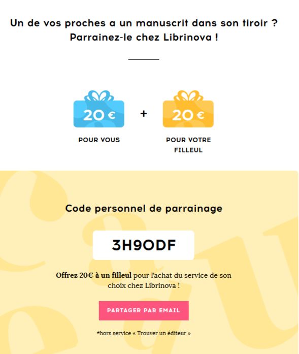 Tu souhaites te lancer en autoédition, notamment via Librinova, et tu aimerais un code promo ? Ne bouge pas, en tant qu’autrice Librinova, je peux te parrainer 🙂